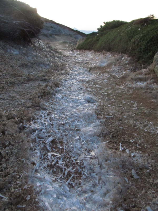 朝の気温は-2度。本山小屋から山頂までの道には霜柱