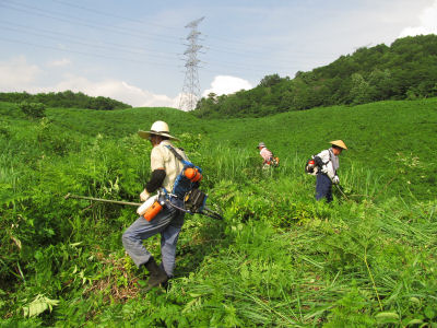 沼沢のわらび園の場合は山焼きをしないので、わらびを負かすような植物が増えないよう、わらび園が終了した後に草刈りをするんです。