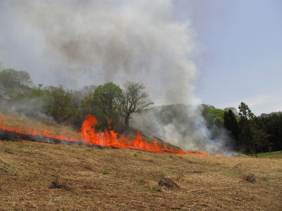 レーキで草をよせて防火線を作った後は、山の上のほうから火をつけて、だんだん火を下のほうへ引っ張っていく。