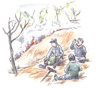 山が燃えているそばでのんびり一服する地元の人たち。
