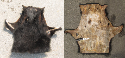 もらった毛皮はこんな感じでした。剥がしたままの皮を長いこと干しっぱなしにしていたみたいで結構ばりばりに硬くなってました。