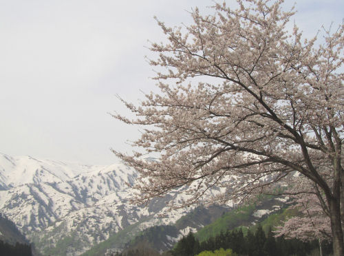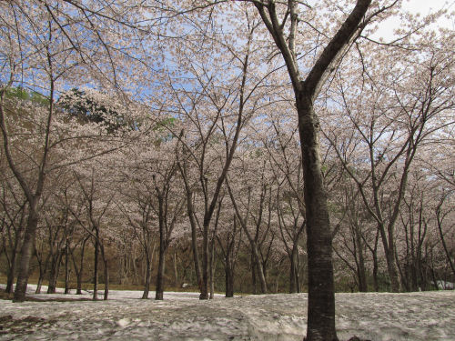 雪が残っている中で桜が咲いているというのがなんとも不思議な感じ。
